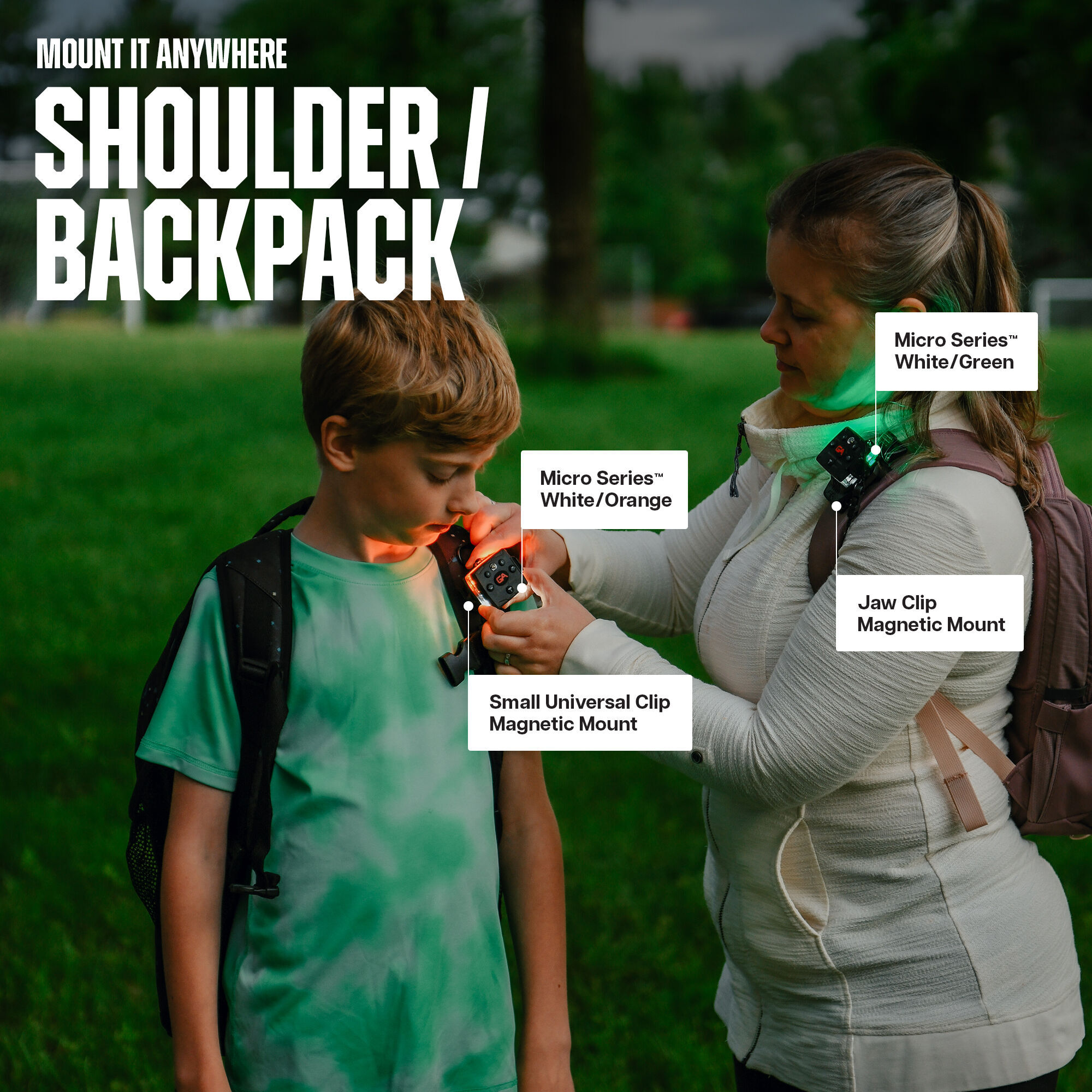 - With multiple mounts available, you can quickly and easily attach your Micro Series™ to backpacks, bikes, strollers, leashes, collars and more.